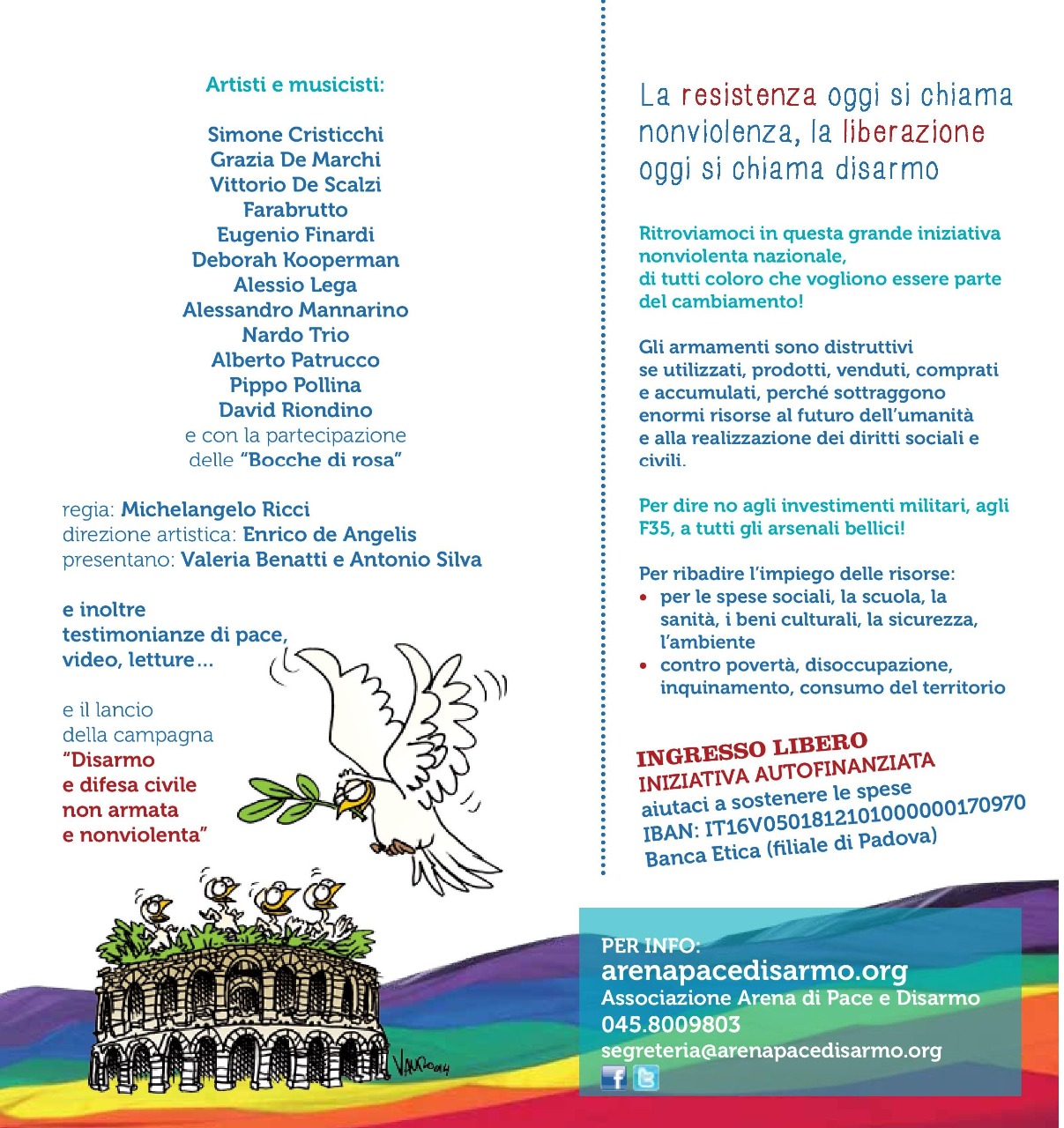 Venerdì 25 aprile, giornata della Liberazione dal nazi-fascismo, sarà celebrata dai pacifisti con lo slogan “La resistenza oggi si chiama nonviolenza, la liberazione oggi si chiama disarmo”. Si inizierà alle ore 12 in piazza Bra con l'inaugurazione, che vedrà come testimonial Cecilia Strada, di mostre fotografiche e pittoriche, mentre la piazza si animerà di flash mob realizzati dagli studenti e dai giovani in servizio civile e arriveranno le biciclettate “resistere-pedalere-resistere” degli Amici della Bicicletta; i cancelli dell'Arena si apriranno alle ore 13 per prendere posto e allestire gli striscioni delle associazioni e i cartelli dei vari gruppi. Alle ore 14 inizierà lo spettacolo con alternanze di testimonianze, musica, letture, video; alle ore 18 verrà presentata la nuova campagna “disarmo e difesa civile non armata e nonviolenta” e poi proseguirà la maratona musicale fino all'imbrunire.