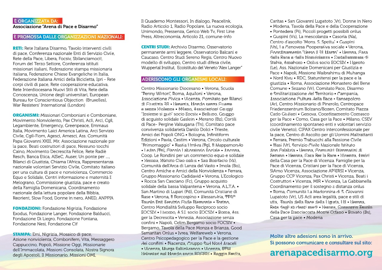 La manifestazione è promossa da un lungo elenco di reti, organismi, fondazioni, media e centri studi ed organizzata dall'associazione “Arena di Pace e Disarmo”. Padre Venanzio Milani, della Fondazione Nigrizia, la descrive come “un racconto di ciò che si sta facendo per costruire la pace”, e Mao Valpiana, direttore di Azione nonviolenta, aggiunge “metteremo in scena le proposte del movimento disarmista e nonviolento” mentre Michela Faccioli, del comitato organizzatore, conclude “sul prestigioso palco dell'Arena vedremo e sentiremo testimonianze, parole e musica che sapranno rappresentare le miriadi di azioni politiche, culturali, sociali che ogni giorno lavorano per la pace e contro la guerra”.