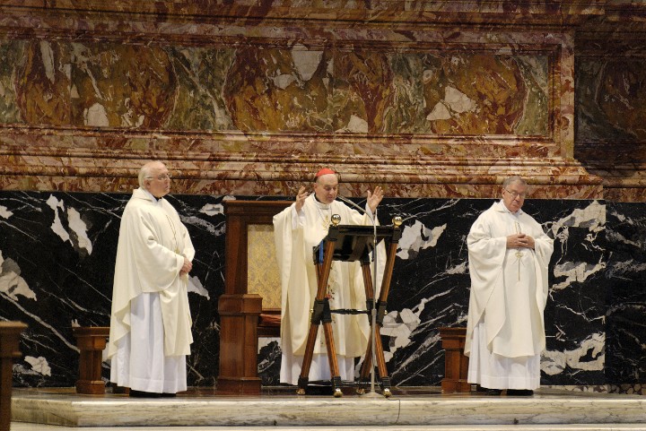 • il celebrante, al centro, con i due accoliti ai lati (due diaconi, o un diacono e un accolito se sono presenti i diaconi);